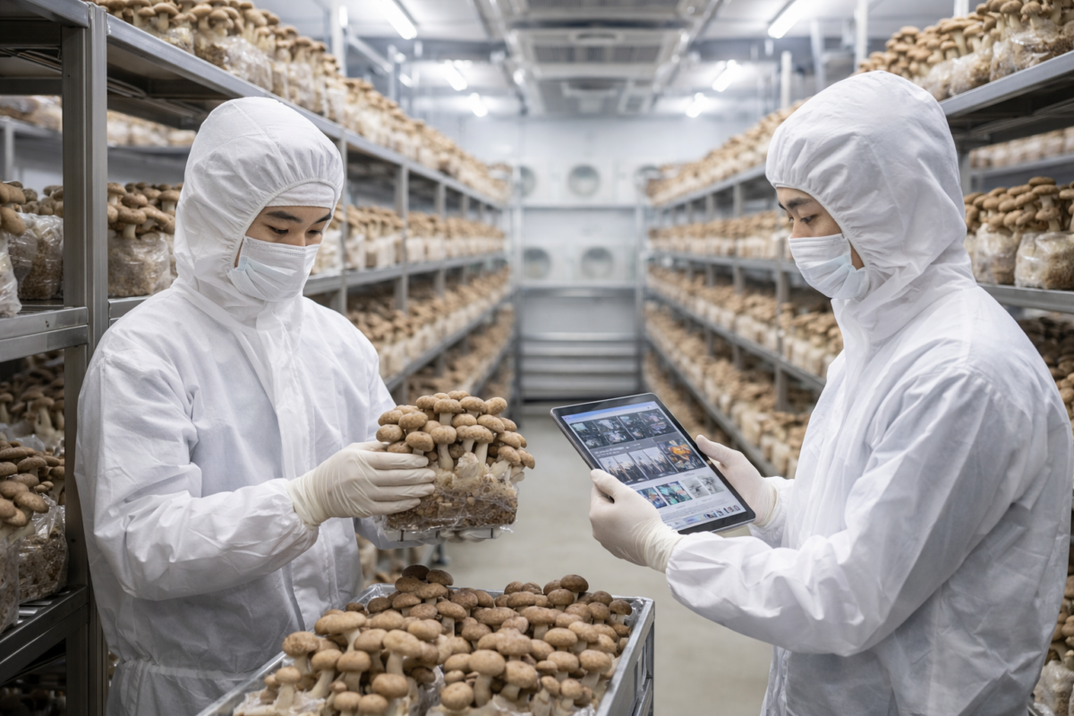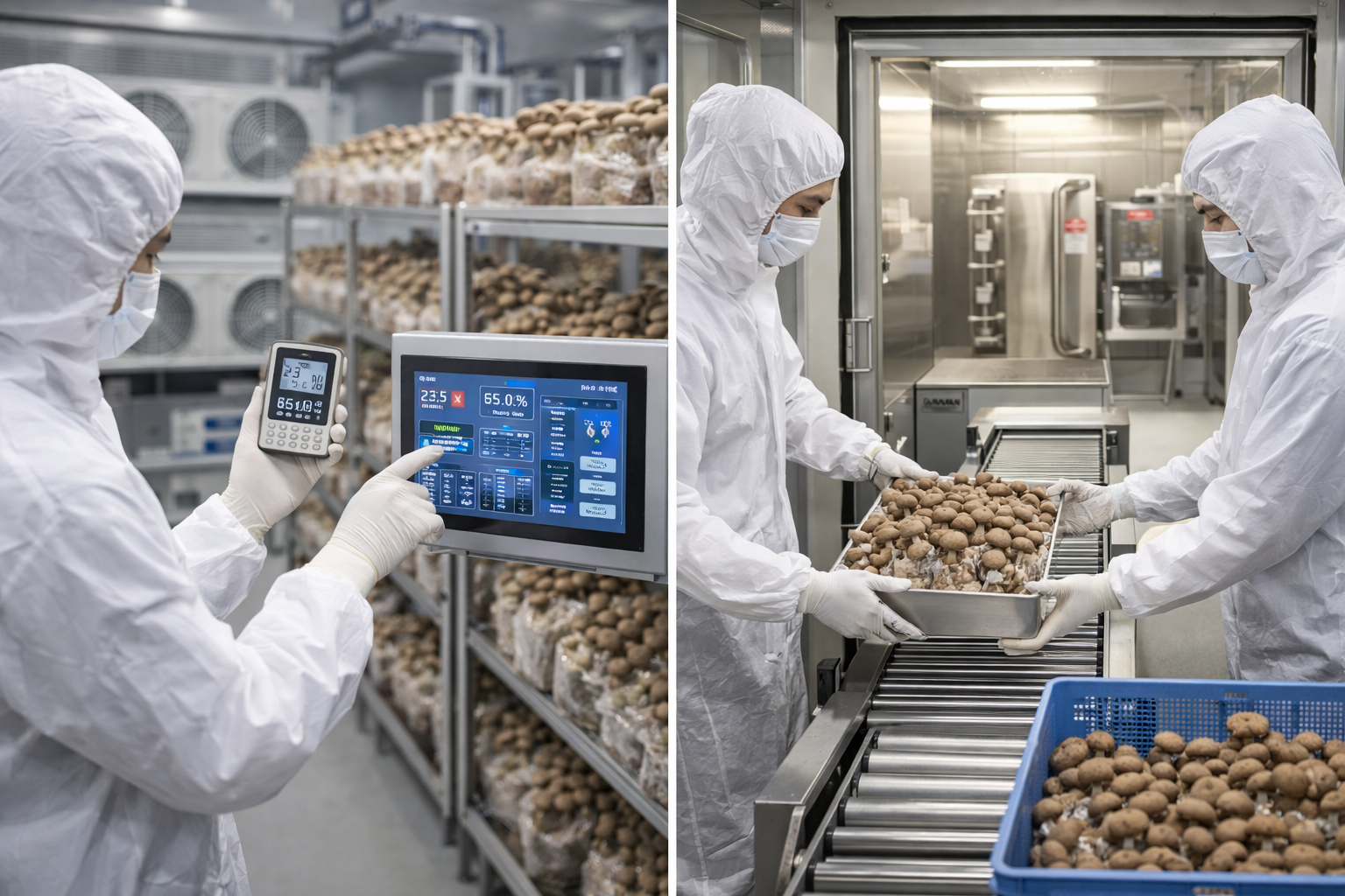Khu vực trồng nấm được quản lý nghiêm ngặt về hệ thống điều hòa không khí và vệ sinh, đảm bảo môi trường sạch sẽ, nơi toàn bộ quy trình sản xuất được thực hiện một cách khép kín.
